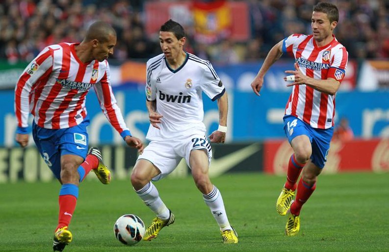 Di María no condujo demasiado la pelota, pero cuando la tuvo en su poder fue para plantear serios problemas a la defensa del Atlético. En la imagen, el argentino controla el balón ante Miranda (i) y Gabi Fernández.