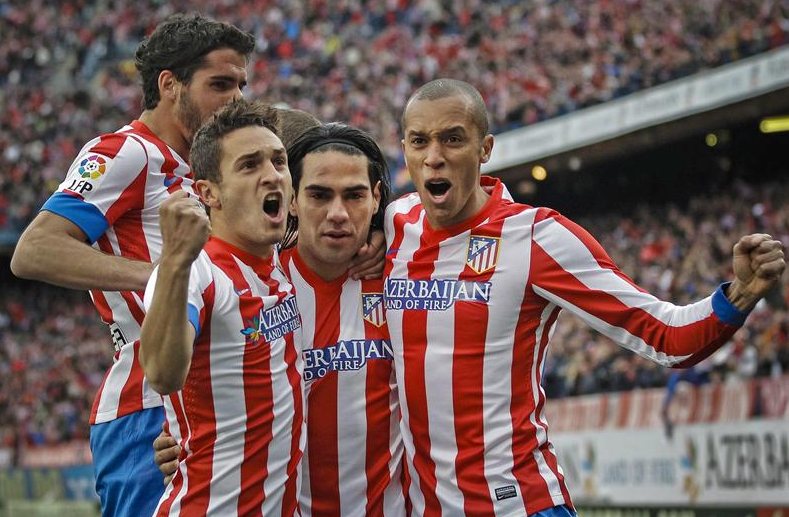 Radamel Falcao (en la imagen, felicitado por Raúl García, Koke y Miranda) fue el encargado de marcar el primer gol del derbi a los cuatro minutos, al cabecear un centro desde la derecha de Godín tras un mal rechace de Diego López.