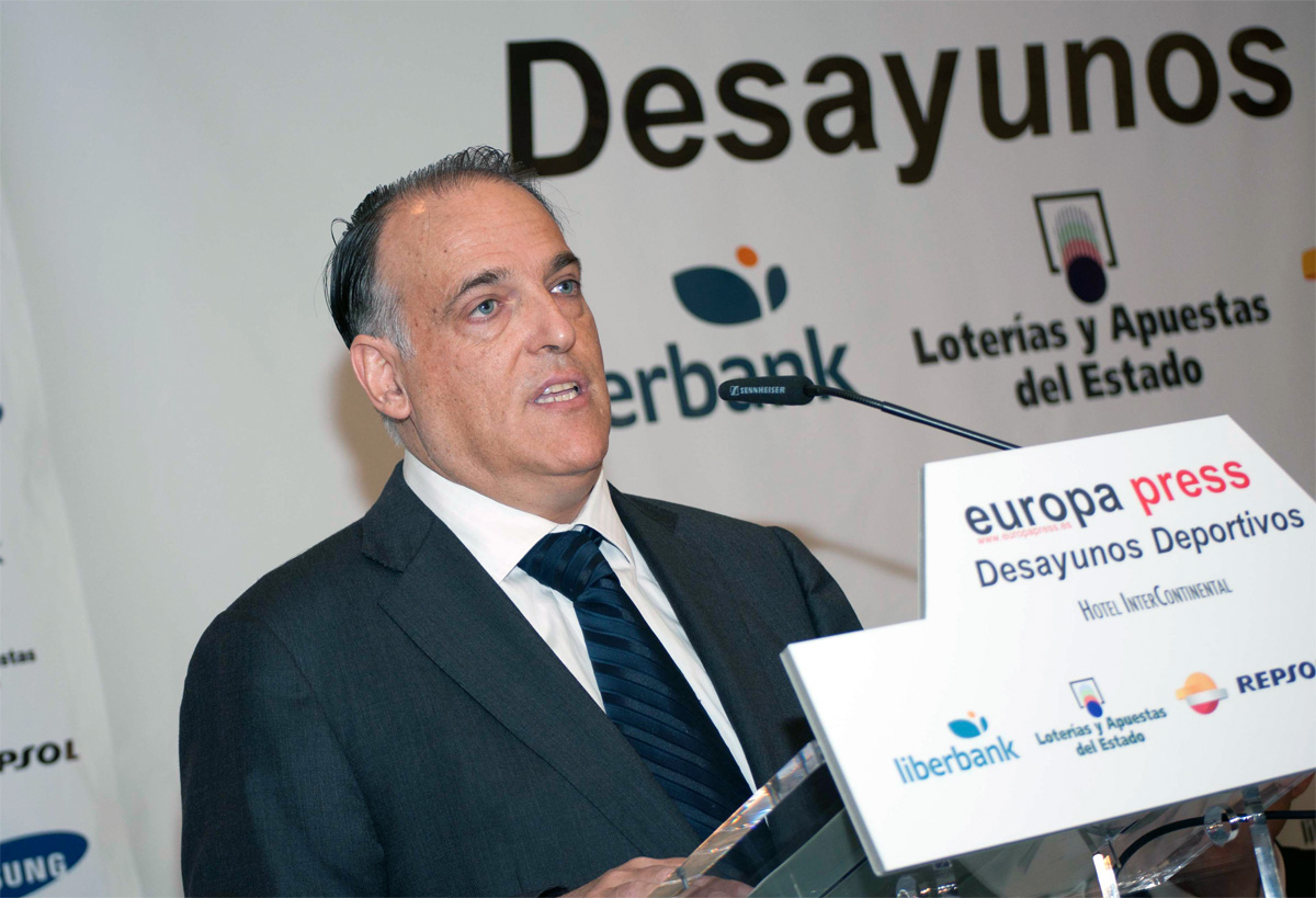 Javier Tebas, que el pasado 26 de abril asumió la presidencia de la Liga de Fútbol Profesional (LFP) en sustitución de José Luis Astiazarán, ha sido el protagonista de los Desayunos Deportivos de Europa Press en un céntrico hotel de Madrid, al que también han acudido presidentes de algunos clubes como Enrique Cerezo (Atlético de Madrid), Ángel Torres (Getafe), Miguel Guillén (Betis) y Augusto César Lendoiro (Deportivo de La Coruña), así como el secretario de Estado para el Deporte, Miguel Cardenal, y el presidente del sindicato de futbolistas AFE, Luis Rubiales, entre otras personalidades.
