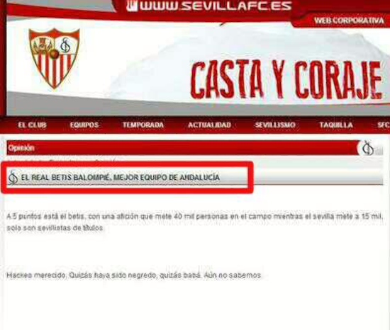 La página web oficial del Sevilla FC ha sido objeto del ataque de un pirata informático este lunes. El hacker no ha dudado en destacar la preponderancia del Betis, poniendo de relieve que el conjunto verdiblanco saca cinco puntos a su rival de la ciudad en la clasificación (52 por 47).