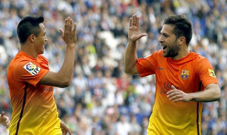 El Barcelona mantiene muy viva la posibilidad de cerrar el campeonato con 100 puntos e igualar el récord de puntuación, después de derrotar al Espanyol por 0-2, en un partido con poca historia, decidido por un gran gol del chileno Alexis Sánchez y de Pedro Rodríguez en los minutos finales. Si los barcelonistas ganan en el próximo partido al Málaga, los azulgranas igualarán los 100 puntos que sumó el año pasado el Real Madrid y que es el récord de puntuación en la historia de la Liga.
