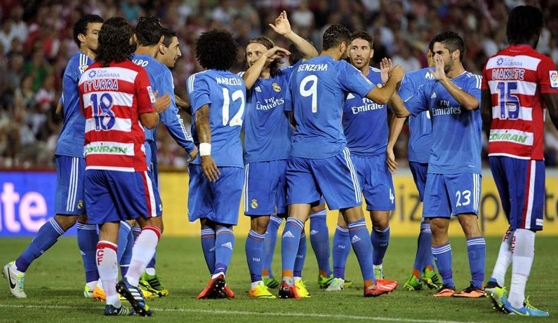 Mucha movilidad en ataque y rápidas combinaciones dieron al Real Madrid un 70% de posesión. Las ocasiones no tardaron en llegar y Di María, espectacular en la primera parte, sirvió un centro perfecto desde la banda derecha. Los defensas del Granada se equivocaron al tirar el fuera de juego y el balón cayó a los pies de Cristiano frente a Roberto. El portugués no consiguió controlar el balón y Benzema se aprovechó para batir al meta local.