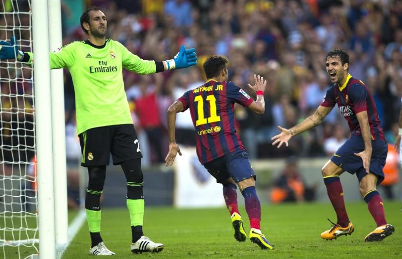 Diego López se lamenta mientras Neymar celebra con Cesc el primer gol del Barcelona.