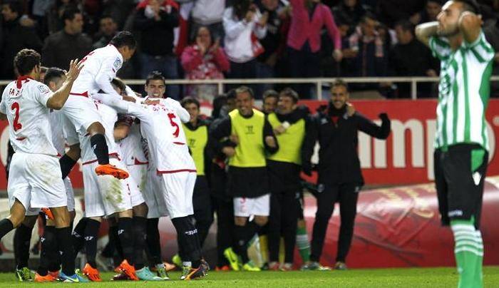 El Sevilla se dio un homenaje en un derbi que ganó por goleada (4-0) al Real Betis, que jugó toda la segunda parte con uno menos por la expulsión del central brasileño Paulao Santos y que quedó muy tocado con una derrota ante el eterno rival que le deja más colista.