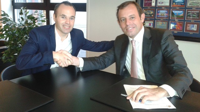El centrocampista Andrés Iniesta ha firmado la renovación de contrato con el Barcelona hasta 2018, en un acto privado junto al presidente del club, Sandro Rosell, en las oficinas barcelonistas, según ha informado la entidad.