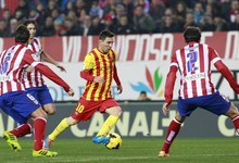 Messi (c), que fue suplente, conduce la pelota ante Koke (i) y Godín. | EFE