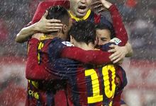 Iniesta celebra junto a sus compañeros uno de los goles del Barcelona. | EFE