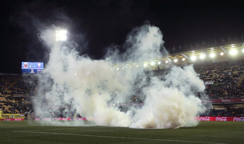 El bote arrojado desde el fondo sur del recinto cayó sobre el área del meta visitante Yoel y despidió una intensa humareda que precipitó la retirada del césped de jugadores, equipo arbitral y el público presente en la grada.