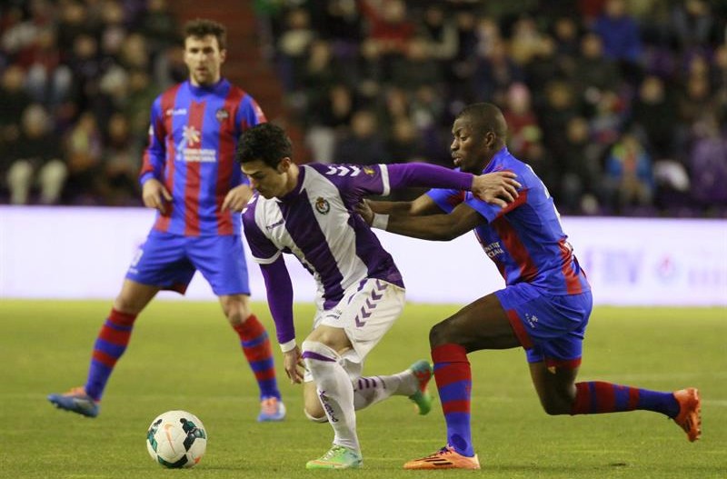 Los blanquivioletas lo intentaron con dos disparos de Javi Guerra (min.19) y Peña (min.22), pero el acierto estuvo de lado del equipo valenciano, que varió el marcador a su favor a través de un cabezazo de Casadesús tras un centro de Ivanschitz (min.25).