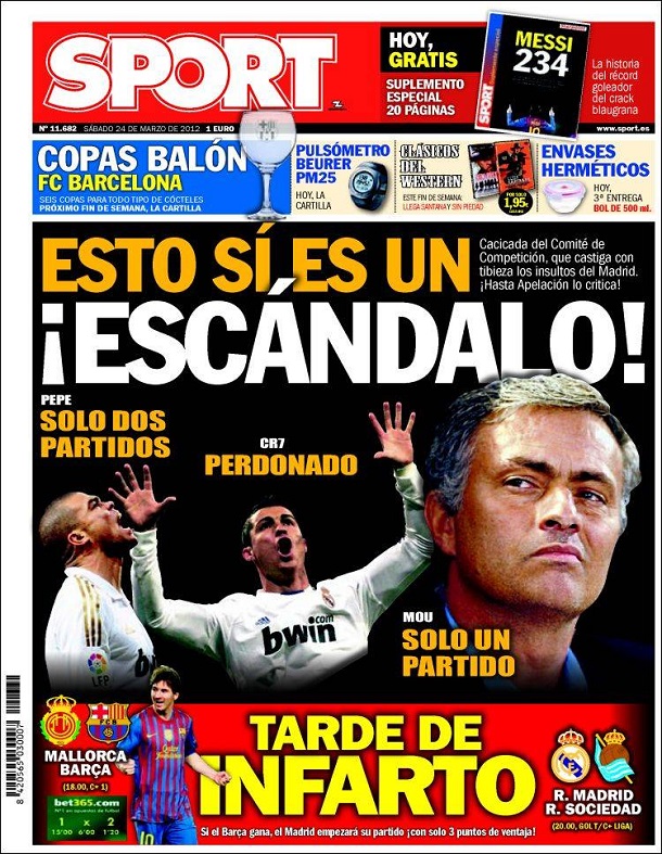 Sport consideró los dos partidos de sanción al portugués y el castigo de un encuentro a Mourinho como un "escándalo".
