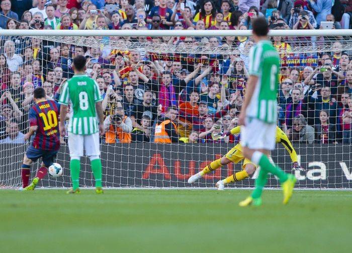 Precisamente, de penalti volvió a ganar el conjunto del Tata Martino ante el Espanyol en el derbi barcelonés (0-1), gracias a una discutible mano de Javi López. Este sábado, la polémica volvió a aliarse con los catalanes, que se aprovecharon de otras dos penas máximas ante el Betis (3-1), decisivas para conseguir un nuevo triunfo que les mantiene a un punto del Atlético de Madrid. Seis jornadas restan para el final de la Liga y el Barça está a un penalti de igualar el registro de los 13 del Real Madrid hace dos campañas.