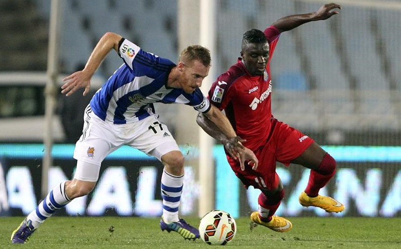La afición realista se puso nerviosa y empezaron los pitos en el estadio donostiarra porque el conjunto getafense era amo y señor del juego y los blanquiazules estaban ausentes, sin patrón y convertidos en un manojo de nervios. Sammir se movía a placer por territorio blanquiazul y Lacen tuvo el 0-1 en un remate tras una jugada colectiva de su equipo que el francés culminó con un disparo al poste del un Zubikarai que aguantaba como podía el chaparrón que le venía encima.
