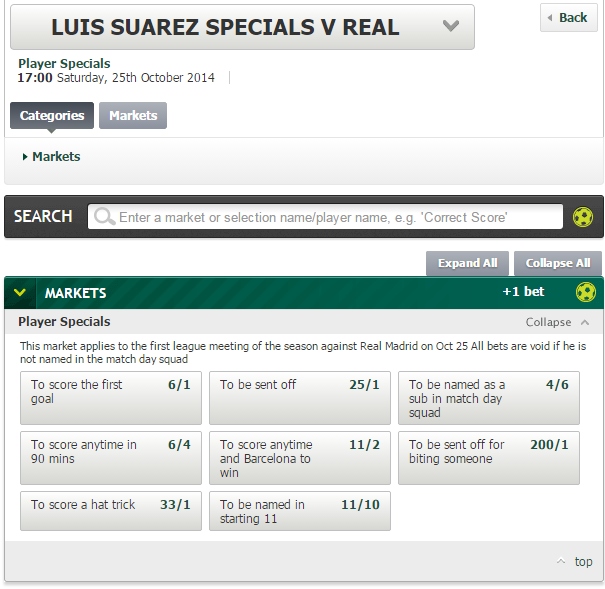 Además de preguntar por el ganador del partido, por los goleadores o por el resultado al final de cada tiempo, en Paddypower encontramos dos apuestas de lo más originales relacionadas con Luis Suárez, que este sábado volverá a la competición oficial tras cumplir una sanción de cuatro meses por su mordisco a Giorgio Chiellini en el Mundial.