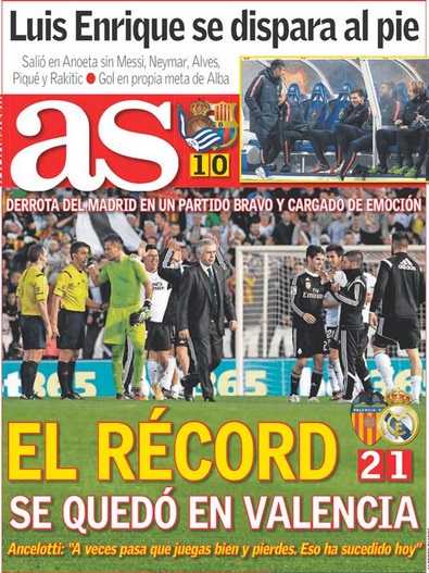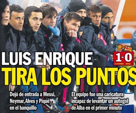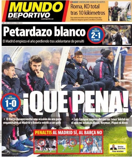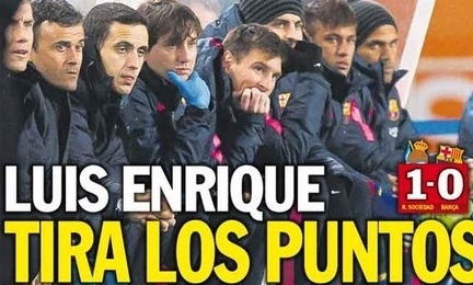 ¡Qué pena! es el titular elegido por Mundo Deportivo que ve cierto paralelismo entre el Tata Martino y Luis Enrique. "Anoeta fue la tumba del Tata Martino, el principio de su cantado y anticipado final, y lo puede ser también para el proyecto de Luis Enrique" afirma. Además añaden que el técnico ha perdido crédito con esta derrota.