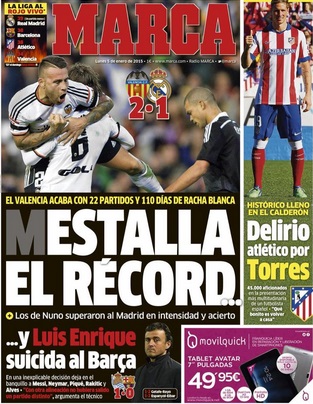 El diario As destaca la derrota del Real Madrid pero deja bastante espacio para Luis Enrique que "se dispara al pie". La foto del banquillo lo dice todo. Neymar, Messi, Pique y Rakitic riéndose antes del comienzo del partido.