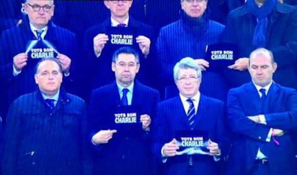 "Todos somos Charlie", escrito en catalán, fue el cartel que lucieron las personas reunidas en el paco entre los que se encontraban, Josep María Bartomeu, presidente del Barcelona y el presidente del Atlético, Enrique Cerezo. Tebas permaneció en silencio sin mostrar ningún cartel en un día en el que se condenaban los ataques a la libertad de expresión.
