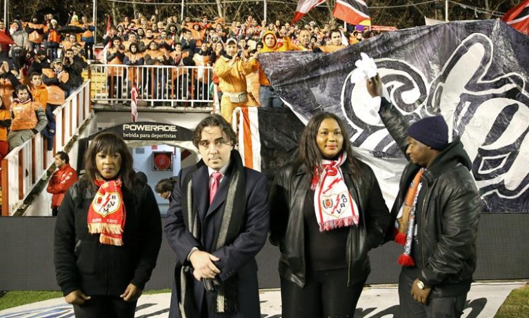 Por último, los tres hijos de Wilfred, que no llegaron a tiempo a Madrid para despedirse de su padre, al que no veían desde hace diez años, recibieron sobre el césped un ramo de flores de manos del presidente del Rayo, Raúl Martín Presa.