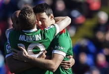 Muniain y Mikel Rico abrazan al goleador (d), Aduriz. | EFE