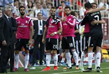Cristiano se abraza con Coentrao delante del banquillo tras el primer gol del Real Madrid en el Pizjuán. | EFE