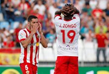 Los jugadores del Almería, durante un partido de Liga contra el Málaga. | Cordon Press