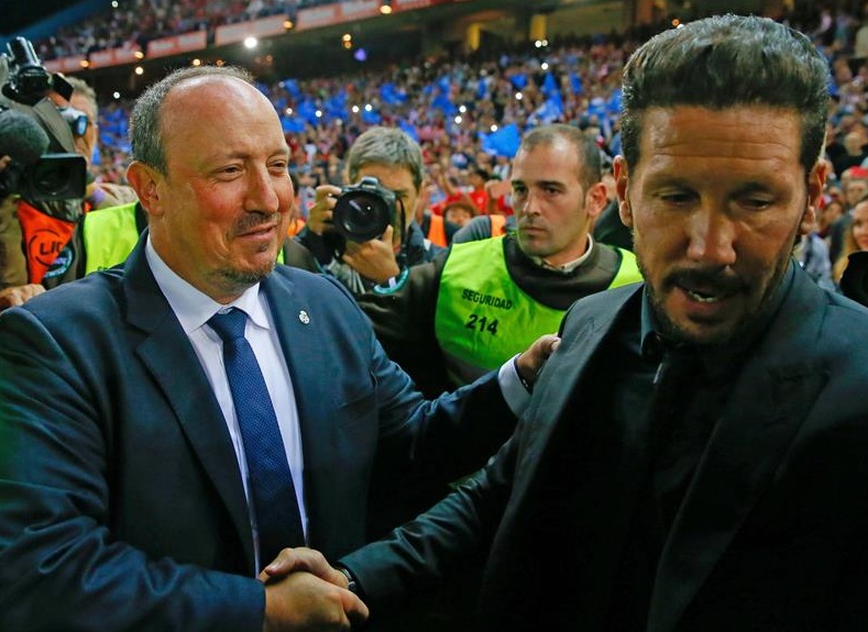 Rafa Benítez, entrenador del Real Madrid (i), saluda a su homólogo del Atlético, Diego Pablo Simeone.