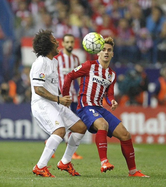 Marcelo disputa un balón con Antoine Griezmann en los primeros compases del derbi.
