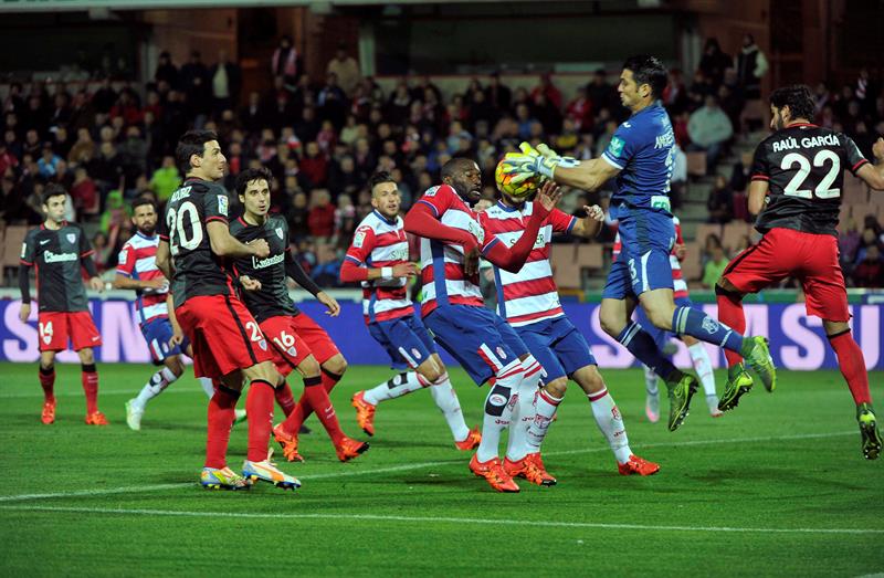 Un cabezazo de Fran Rico ante el que intervino Iraizoz fue la única vez hasta el descanso que el Granada volvió a acercarse a la meta de los visitantes, que no rozaron el empate hasta el epílogo del primer tiempo.