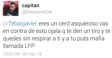 El agresor de Mariano Rajoy ya demostró el pasado 15 de marzo su carácter violento. Con motivo de la polémica suscitada por la pitada al himno nacional en la final de la Copa del Rey de la temporada pasada, que disputaron el F.C. Barcelona y el Athletic de Bilbao en el Camp Nou, el joven contestó al presidente de la Liga de fútbol profesional con el siguiente tuit.