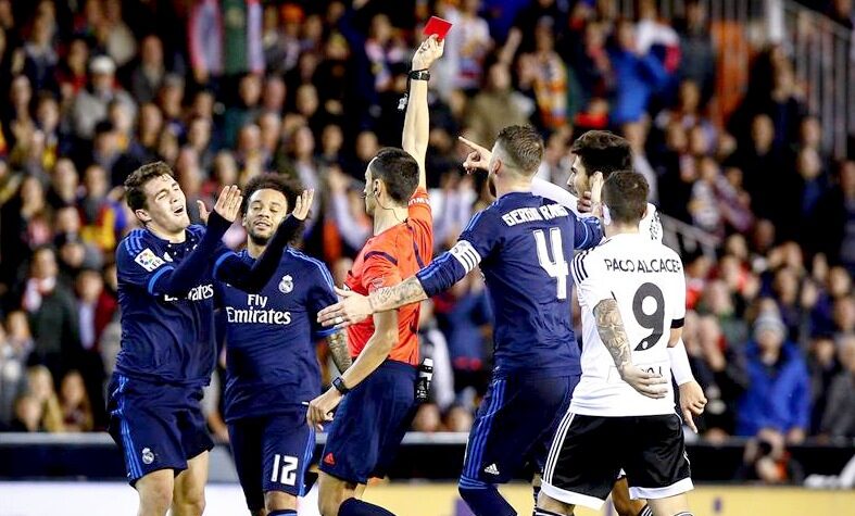 Si Sánchez Martínez dejó sin sancionar el posible penalti a Bale, tampoco quiso saber nada cuando Cristiano Ronaldo cayó en el área ante Abdennour y tras la salida de Jaume. En la continuación de la jugada, Kovacic vio la roja directa tras una fuerte entrada por detrás a Cancelo, lo que hacía prever un cambio de escenario en el partido, aunque curiosamente fue cuando reaccionó el equipo blanco. Para entonces ya no estaba en el campo Benzema, sustituido por Lucas Vázquez.