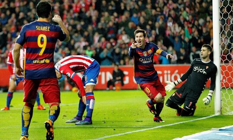 En el minuto 20, Cuéllar sacó un balón a Luis Suárez, que se plantó solo ante él tras un gran pase de Neymar, y, apenas cuatro minutos después, el Barça se adelantó en el marcador con un gol de Messi -el 300 en su cuenta como azulgrana-, con un gran disparo desde el borde del área. La respuesta sportinguista fue, no obstante, meritoria y, tan sólo dos minutos después, el equipo de Abelardo sorprendió con una contra perfecta que concluyó con un pase de Álex Menéndez al segundo palo, donde apareció Carlos Castro para batir a Claudio Bravo en medio de la algarabía del abarrotado Molinón.
