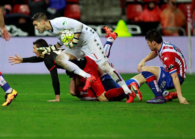 Una falta de Vranjes a Muniain unos metros más allá del ángulo derecho del área grande de la portería de Cuéllar fue lanzada por Beñat, que sorprendió al portero rojiblanco, que había dado un paso al centro de la portería (0-1, m. 27).