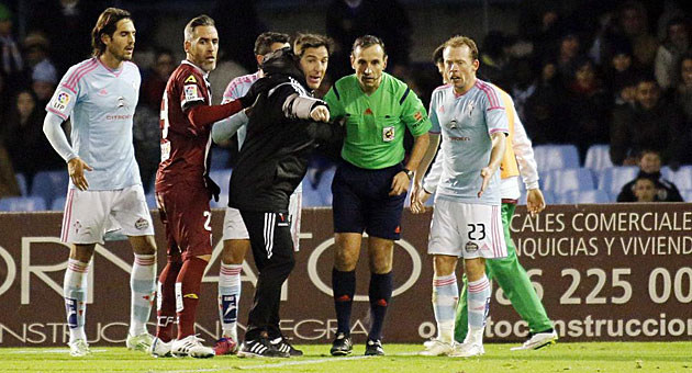 Tras una primera parte sublime, la ansiedad y la falta de acierto dejaron vivo al conjunto andaluz. Cuando quedaban 7 minutos para el final del partido, y con el Celta ganando 1-0, una acción en el área entre Planas y Rossi fue sancionada por el mayor de los Teixeira Vitienes como penalti. Cuando el colegiado se dirigía hacía el punto fatídico, con todos los jugadores protestando, Berizzo tuvo un impulso. Salió como un poseso desde su banquillo hasta el área céltica y le indicó al colegiado cántabro que la acción se había producido fuera del área. Ese instante, ese segundo, hizo dudar a Teixeira, que tras consultar con su asistente, pitó juego peligroso de Rossi. Una decisión, que quizá, salvó la cabeza del Toto.