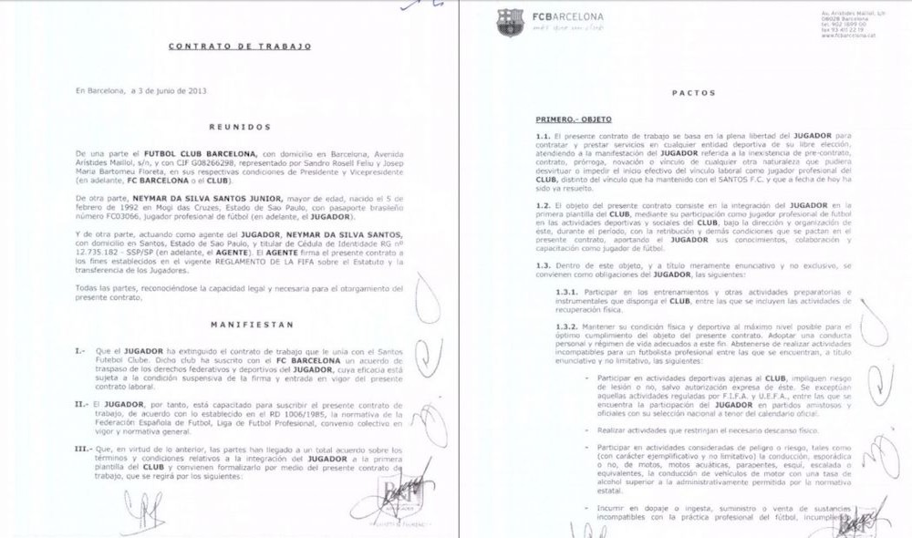 El contrato -que reúne la firma del propio Neymar, de su padre y agente-, así como de Sandro Rossell y Josep María Bartomeu, también cuenta con una prima por el fichaje del brasileño por el conjunto de la Ciudad Condal: 8,5 millones de euros de regalo de bienvenida.