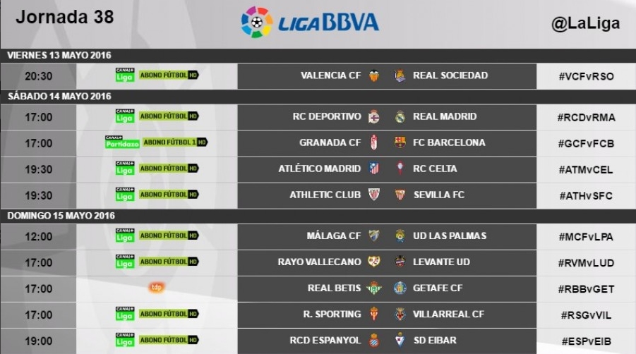 La última jornada de la Liga BBVA de la temporada 2015/16, que se disputará entre el 13 y el 15 de mayo, contará con cuatro horarios diferenciados a lo largo del fin de semana.