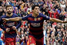 Luis Suárez celebra uno de sus dos goles al Espanyol. | EFE
