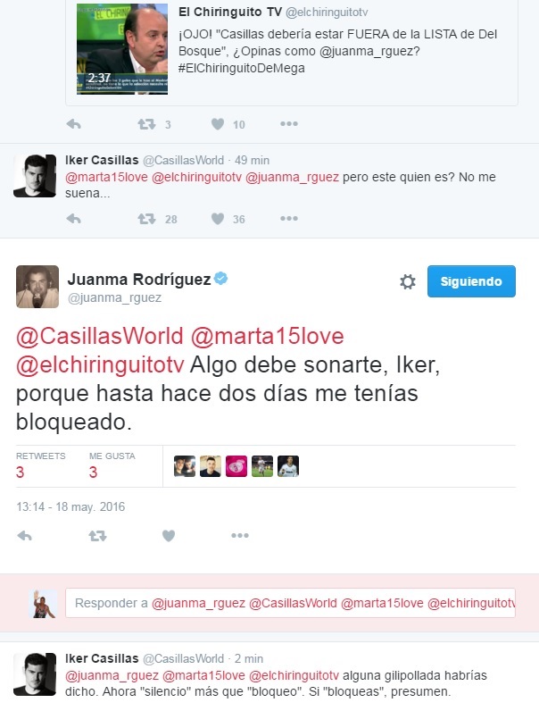 Tras subir un usuario de Twitter un vídeo de el programa El Chiringuito de Jugones que se emite en Mega y que presenta y dirige Josep Predrerol, en el que Juanma Rodríguez, el periodista de Libertad Digital y director y presentador de El Primer Palo, programa deportivo nocturno de esRadio, daba su punto de vista sobre la convocatoria de Iker Casillas para la Eurocopa de Francia, entraba en escena el actual guardameta del Oporto.