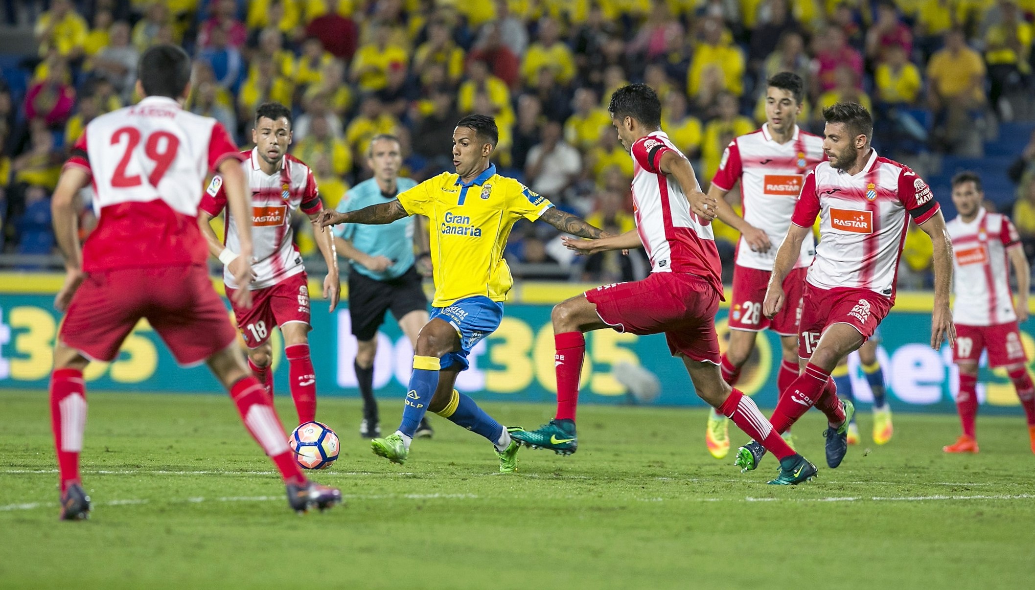 La Unión Deportiva tiene peligro arriba, es indudable, pero también lo tiene atrás. Su línea defensiva adelantada, muchas veces desequilibrada, le generó problemas, pero el conjunto catalán no lo supo aprovechar. La ocasión más clara la tuvo Leo Baptistao al plantarse solo ante Lizoain, pero el brasileño quiso ser generoso y cederle el balón a Gerard, pase que interceptó David García, el jugador que había originado el problema con su posición.