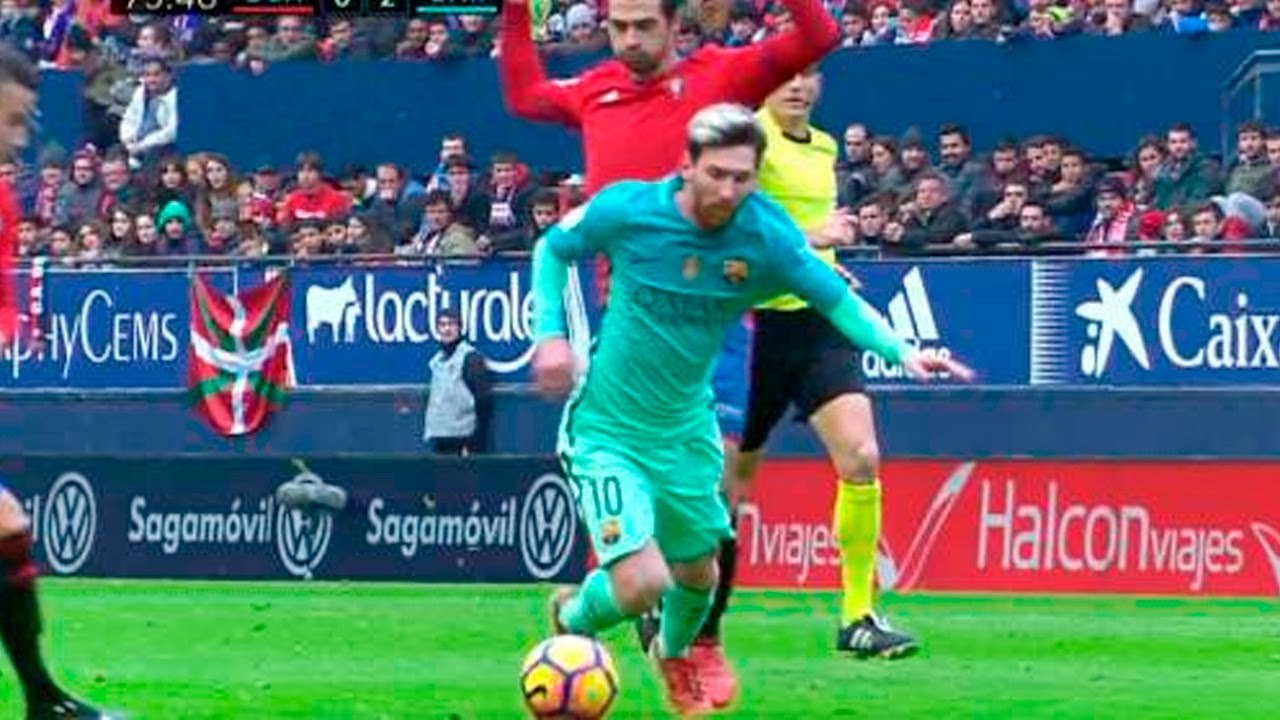 Tras ver que el árbitro no picaba pitando falta, Messi negó con la mano que existiera contacto alguno evitando que el colegiado le enseñara cartulina amarilla por simular.