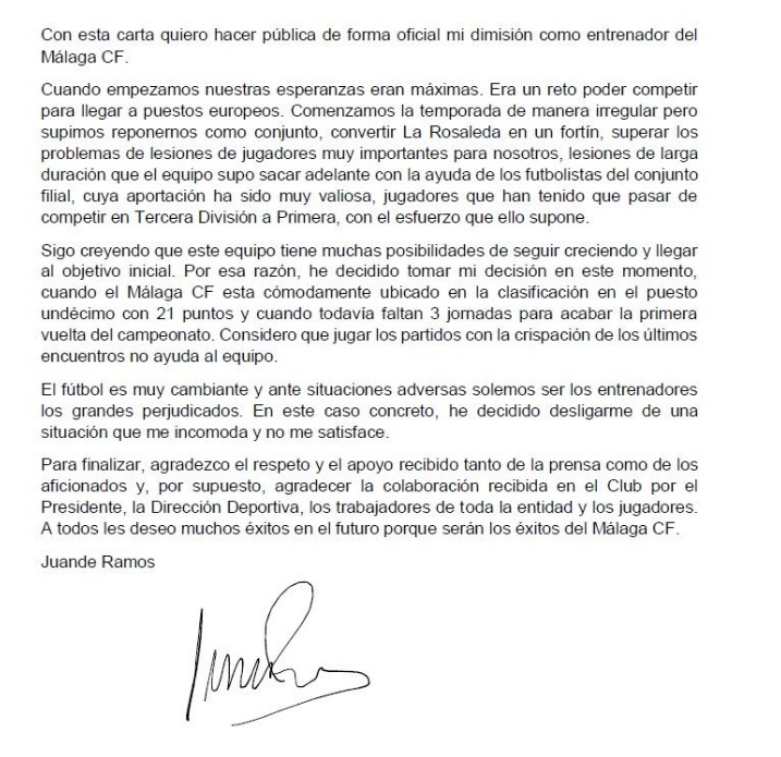 "El Málaga quiere agradecer a Juande Ramos su trabajo y honestidad y le desea mucha suerte para el futuro en su vida profesional y personal", indica el Málaga en un comunicado.