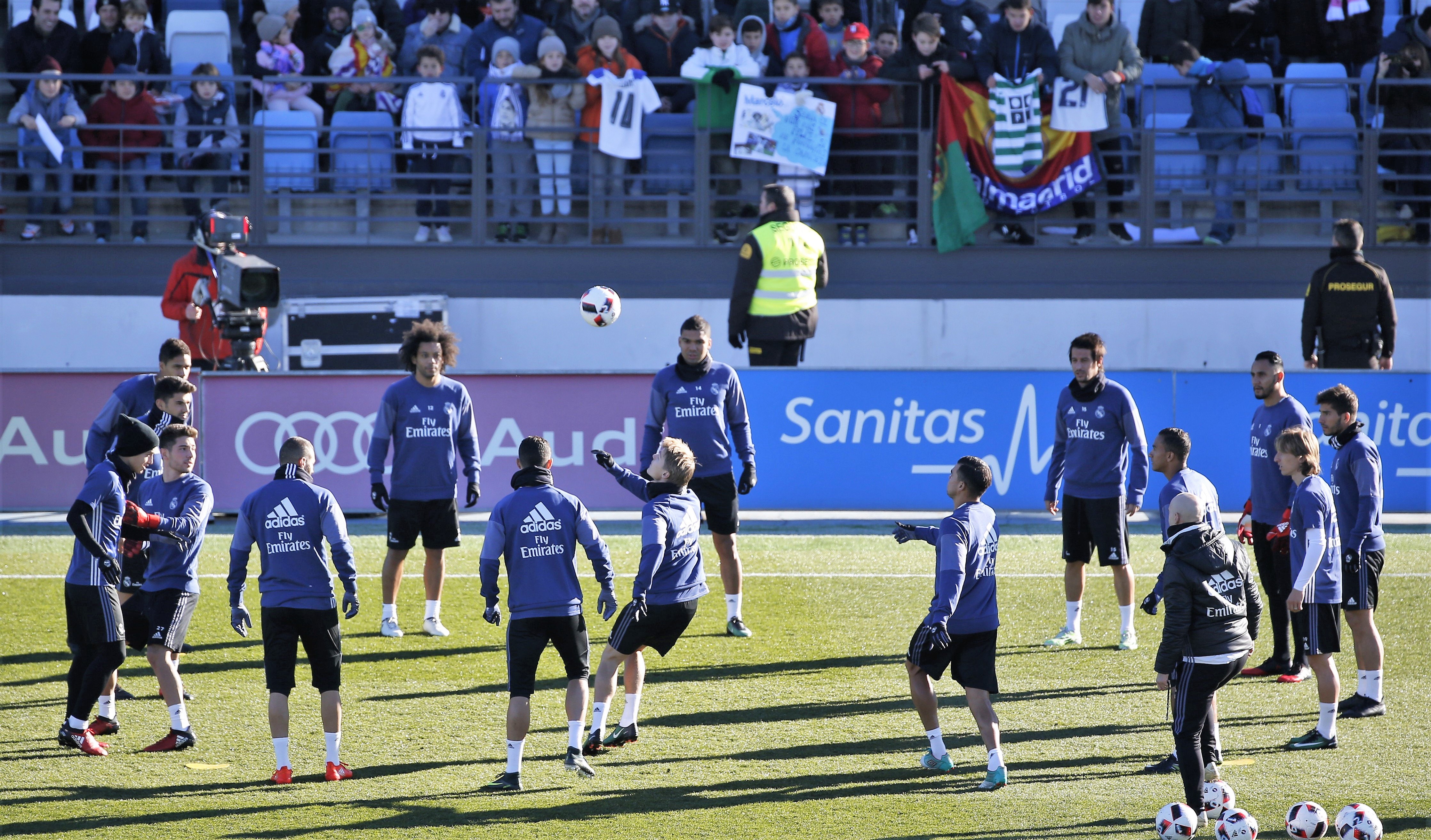 Zidane cerró el año a lo grande igual que como lo empezó. Y, para que a nadie se le olvidaran sus éxitos, el club exhibió sus tres trofeos justo en la salida de los vestuarios. La Liga de Campeones, la Supercopa de Europa y el Mundial de Clubes lucieron para deleite de los aficionadosque se acercaron al Alfredo Di Stéfano para ver a sus ídolos.