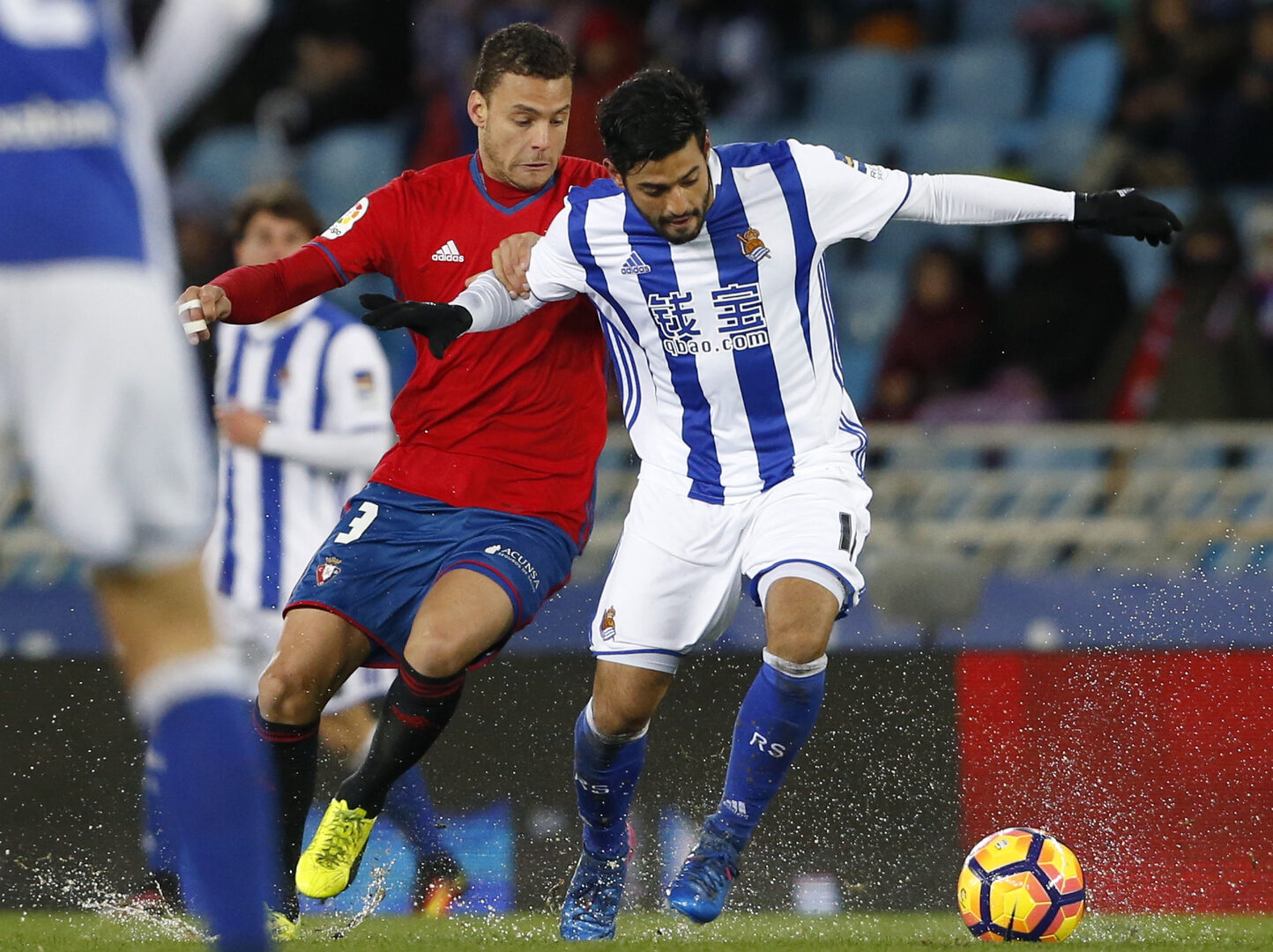 Osasuna se creció ante las adversas condiciones y suyos fueron los acercamientos más peligrosos en la primera mitad, sobre todo el de Kenan Kodro, ex de la Real e hijo de Meho Kodro, que en un mano a mano con Gero Rulli estrelló su remate en las piernas del cancebero argentino.