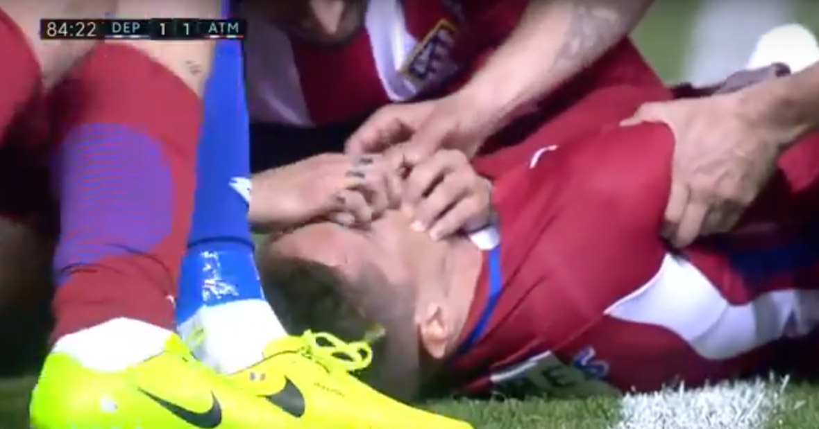 El jugador del Atlético de Madrid, Fernando Torres, cayó sobre el césped de Riazor tras un encontronazo con el jugador del Deportivo, Bergantiños, en la recta final del choque entre ambos conjuntos. La jugada tuvo lugar en un salto y Torres acabó golpeando su cabeza violentamente con el suelo.