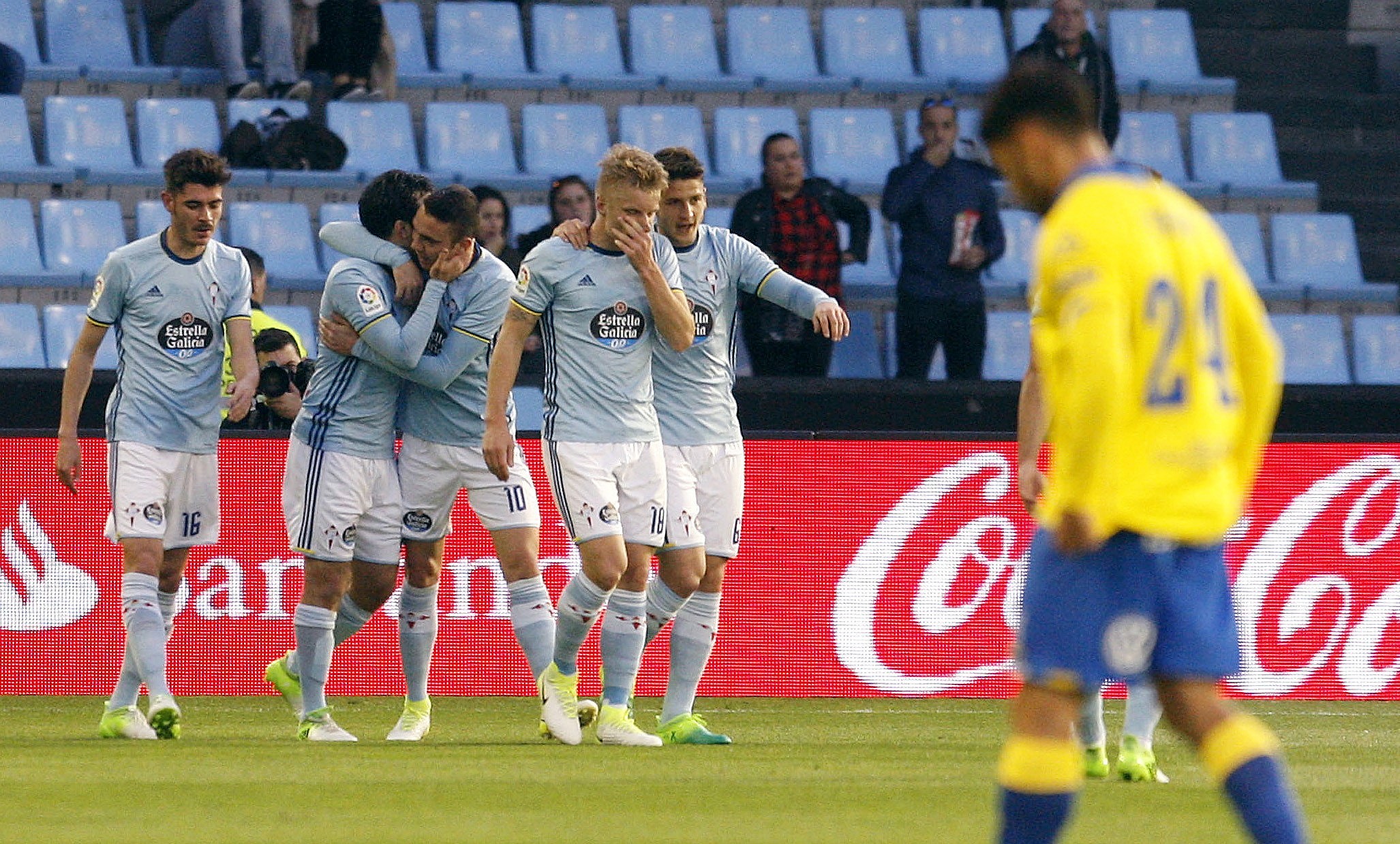 Solo le faltó al Celta más pegada, como en muchos otros partidos. Tuvo ocasiones. Primero llegó un aviso de Jozabed con un lanzamiento al travesaño (minuto 9). Después, el gol de Rossi, que aprovechó, como delantero oportunista, un error defensivo enorme de Bigas (minuto 12). Las Palmas fue un juguete en manos del Celta, más agresivo en la presión, más rápido en el toque de pelota. El gol de Rossi disparó el acoso gallego sobre la portería canaria: un tiro de falta de Wass (minuto 15), otro de Aspas que se envenenó para Lizoain al golpear en la barrera (minuto 19), un cabezazo de Rossi a la salida de un córner (minuto 20) o un mano a mano de Aspas ante el portero tras un pase largo de Wass (minuto 25). Todas esas ocasiones no tuvieron el botín del gol.
