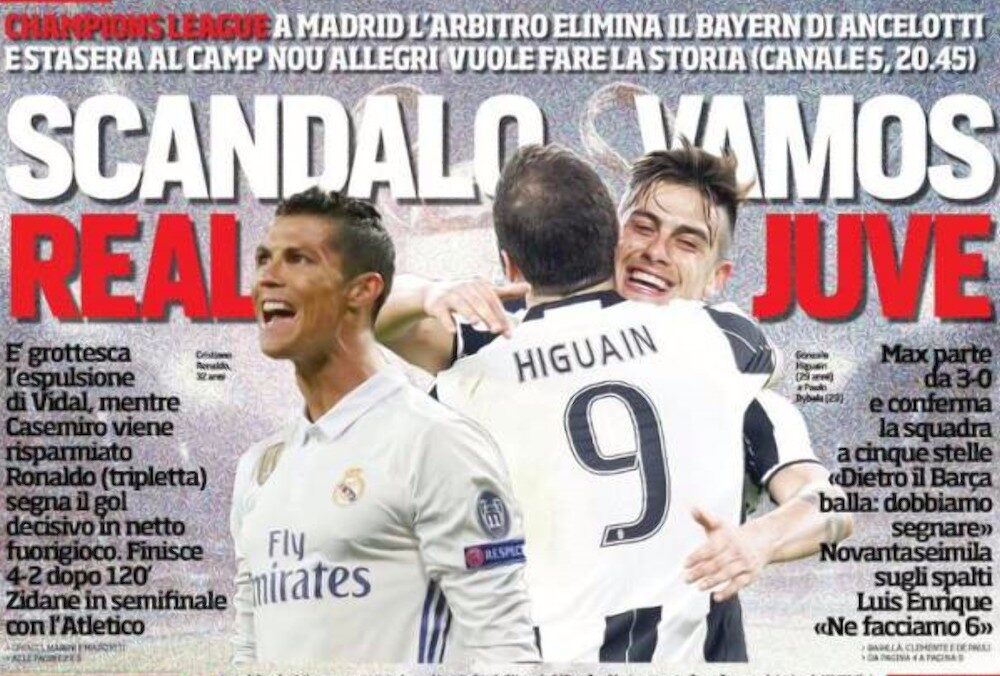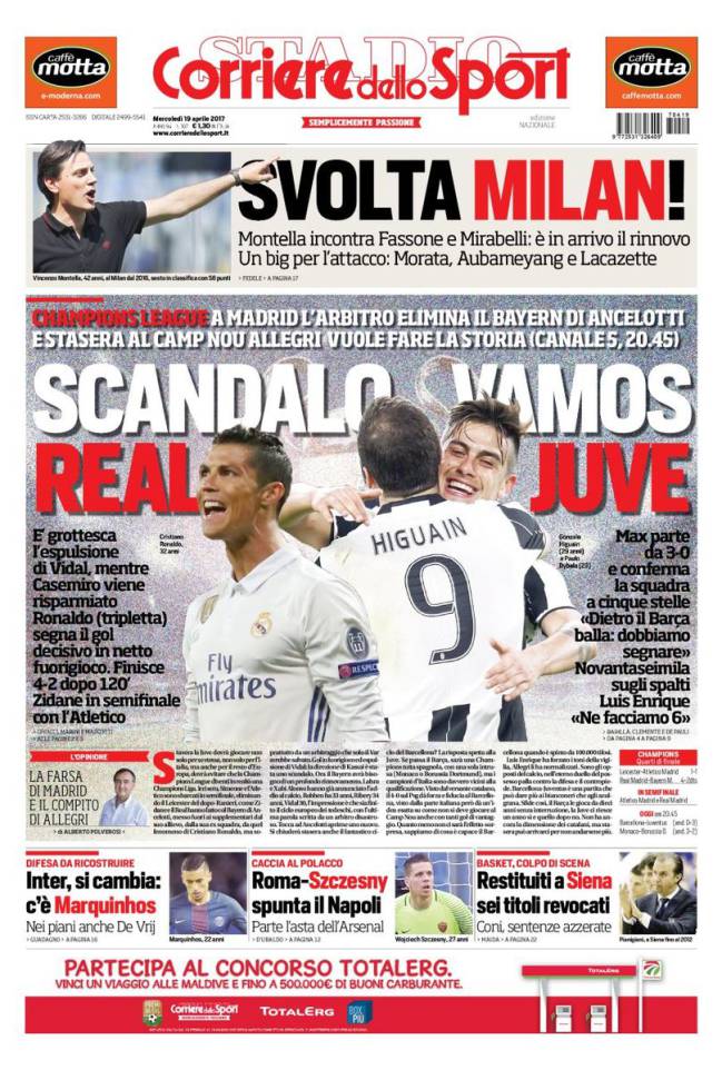 Corriere dello Sport (Roma, Italia): "Escándalo Real".— "El árbitro elimina al Bayern de Ancelotti. Grotesca expulsión de Vidal mientras Casemiro es perdonado. Ronaldo (triplete) firma el gol decisivo en claro fuera de juego. La farsa de Madrid".