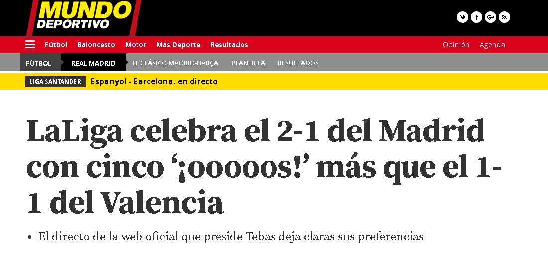 Así, Mundo Deportivo denuncia tal hecho de la siguiente forma: "Mientras el 1-1 logrado por el valencianista Dani Parejo fue narrado así -"Gol! Real Madrid 1, Valencia 1. Daniel Parejo (Valencia) marca de libre directo, remate con la derecha a la escuadra izquierda". el 2-1 que significó la victoria merengue lo explicaron así -¡Gooooool! Real Madrid 2, Valencia 1. Marcelo (Real Madrid) remate con la derecha desde el centro del área por el lado derecho de la portería. Asistencia de Álvaro Morata-. Además de colocar el signo de admiración al segundo tanto del Real Madrid, por si aún no había quedado claro el entusiasmo, se le añadieron hasta cinco ‘ooooos’ más a la palabra ‘gol’ en el caso de Marcelo".