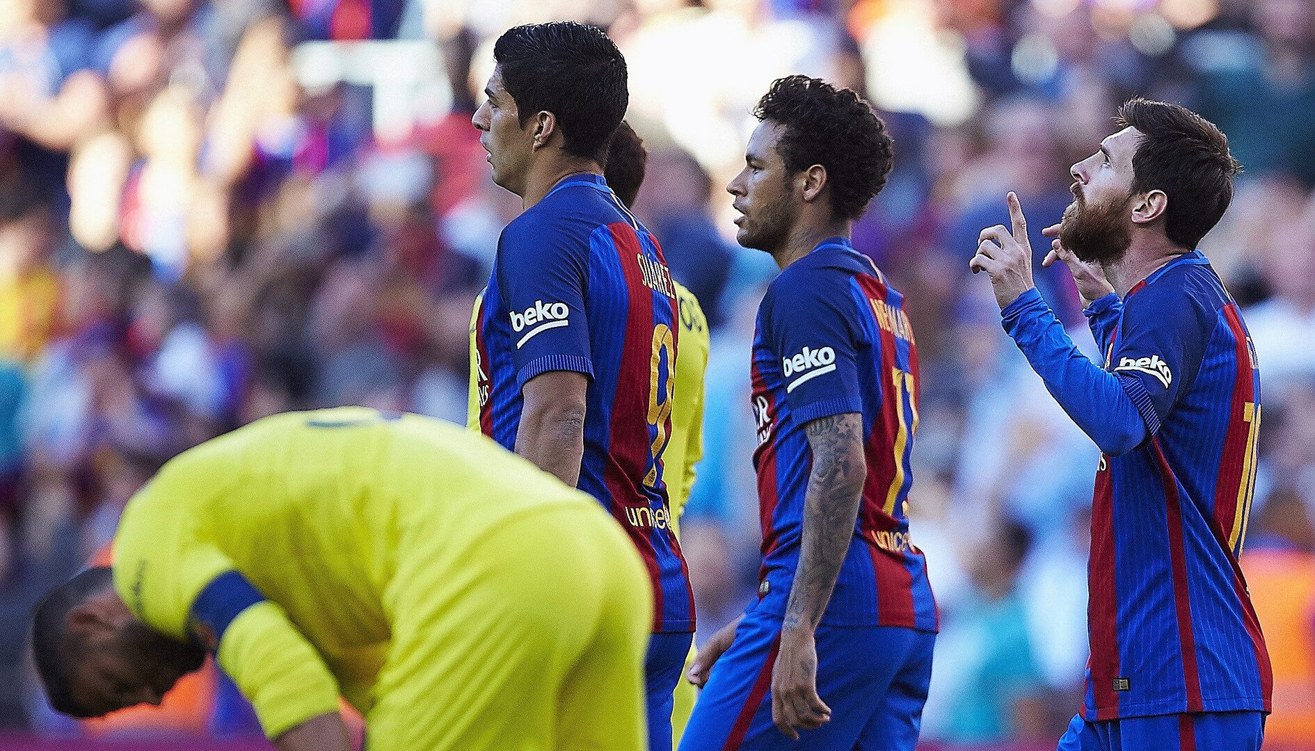 Primero Neymar, reencontrándose con el gol tras diez jornadas, luego Messi, con la enésima maravilla que ha salido de sus pies, y por último Suárez, con rabia contenida y tropezándose, golpearon la férrea defensa visitante, que solo puso contra las cuerdas a los culés durante 15 minutos, lo que hubo de tiempo entre el empate a uno de Bakambú y el 2-1 de Messi al borde del descanso. Con el resultado, el submarino amarillo se aleja un punto más de la cuarta posición, que le hace virtualmente abandonar sus opciones de asaltar el último puesto que da acceso a la Champions, que sigue ostentando el Sevilla, seis puntos por encima cuando restan todavía seis puntos por jugar.