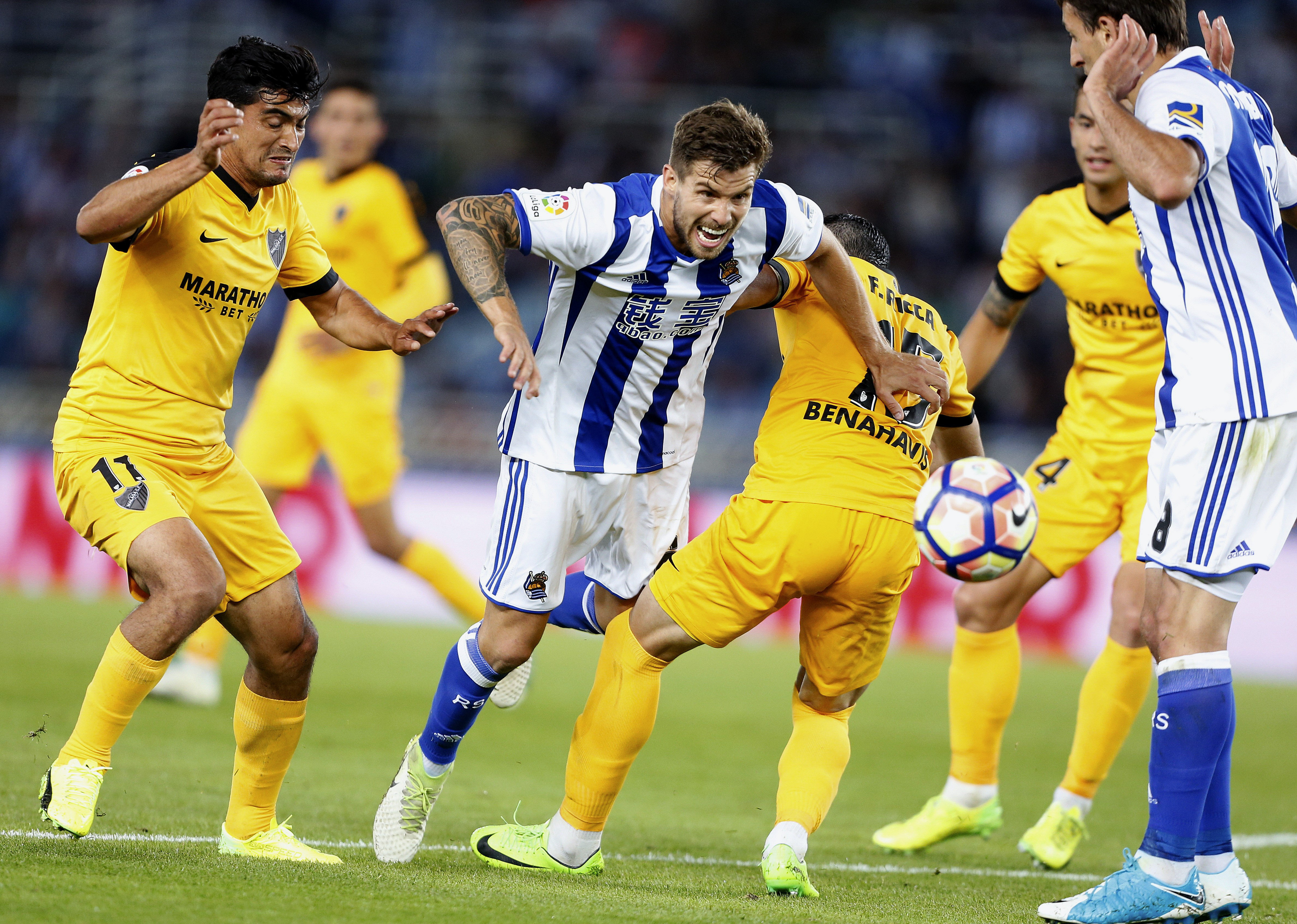 El Málaga se defendió con criterio pero sufría en la acometidas de los vascos que volvieron a tener cerca el gol en un mano a mano de Oyarzabal con Kameni que el delantero realista erró al cruzar demasiado el balón.