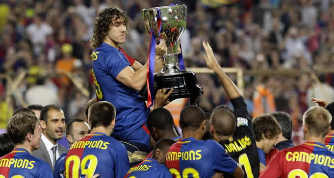 Abidal y Tito Vilanova levantaron el título liguero que consiguieron a falta de tres jornadas. El Real Madrid no pasó del empate ante el Espanyol y el Barcelona fue campeón sin jugar.