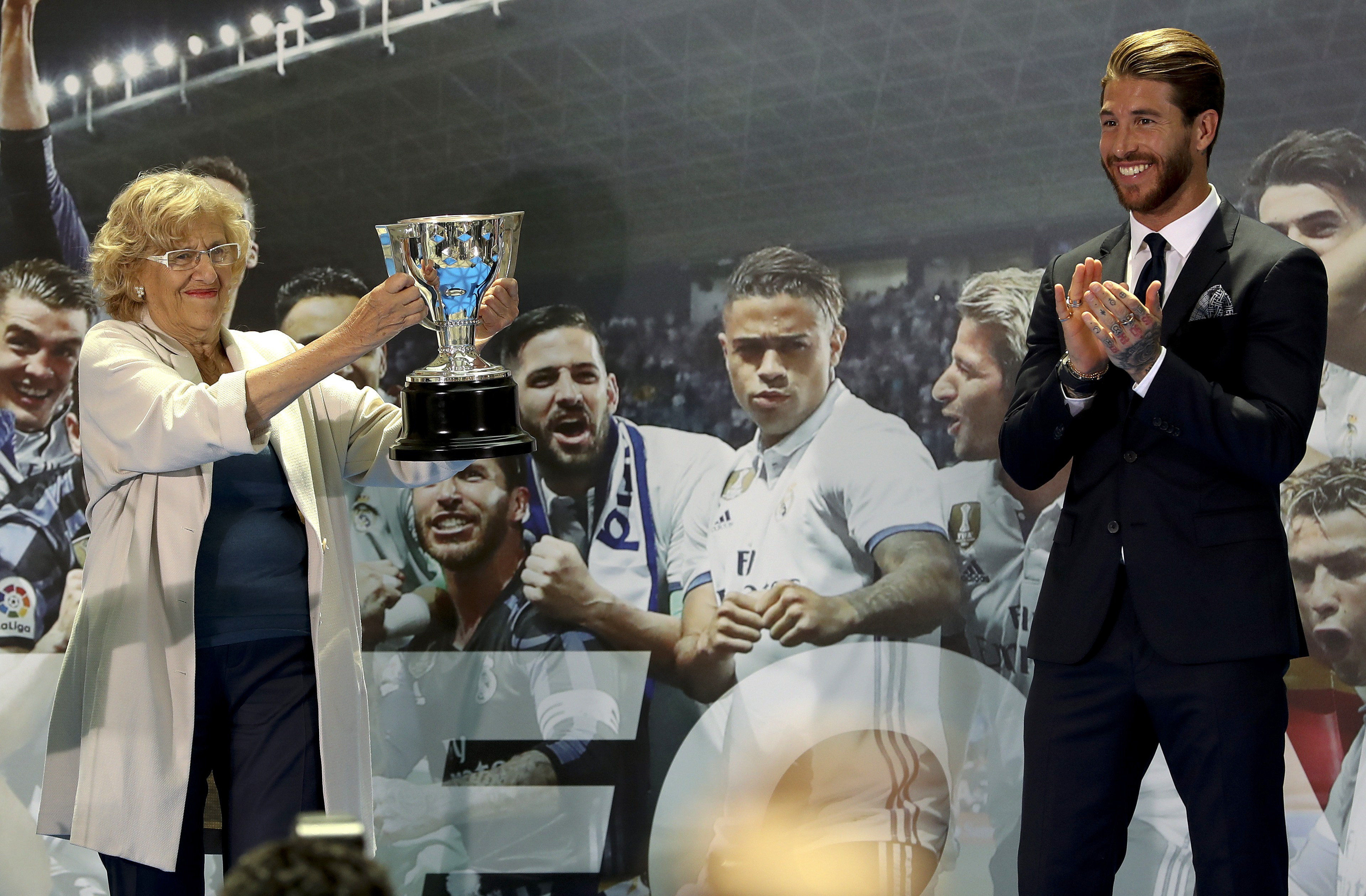 La alcaldesa de Madrid, Manuela Carmena, posa con el trofeo de la Liga junto al capitán del Real Madrid, Sergio Ramos.