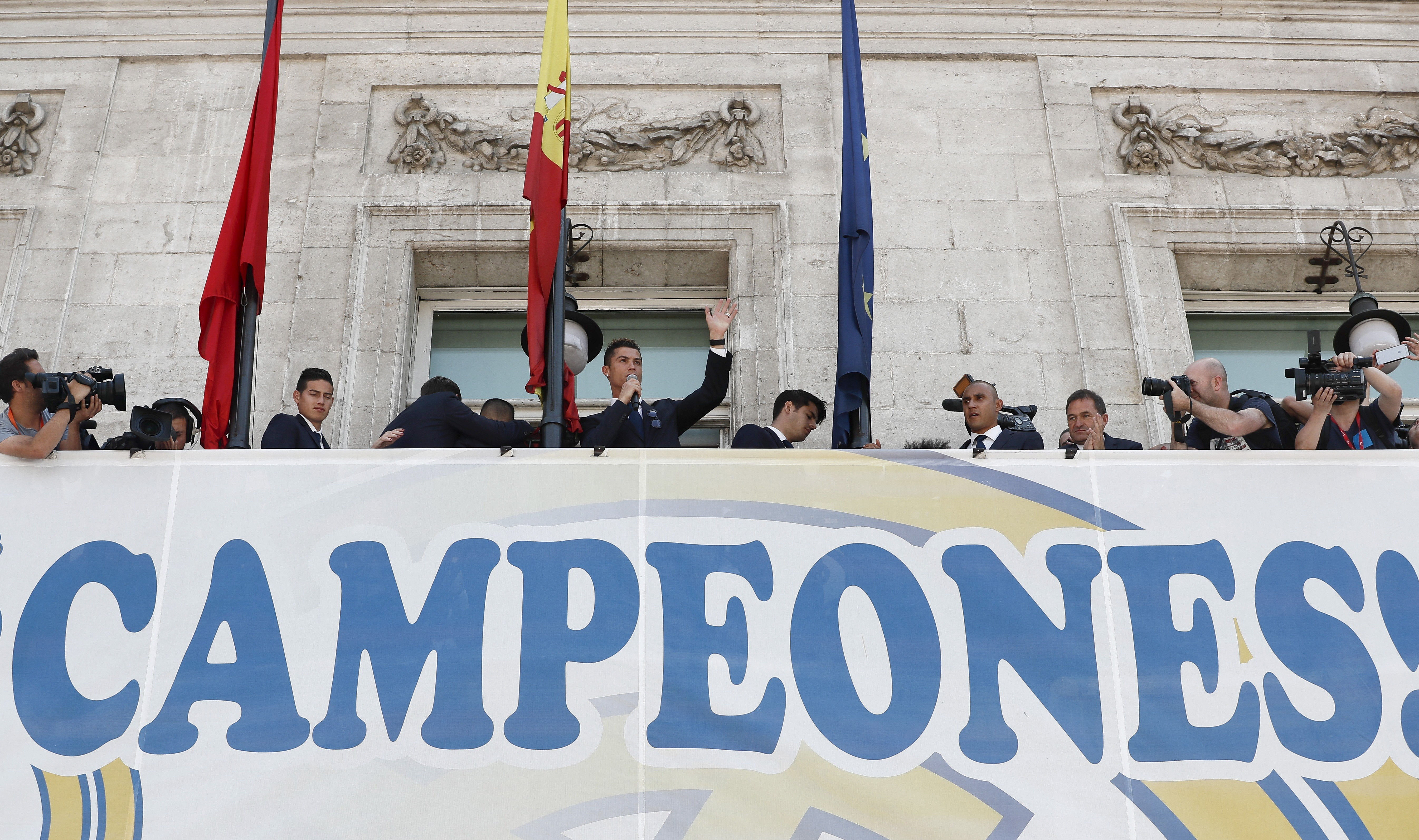 Los jugadores del Real Madrid saludan a la afición desde el balcón de la Real Casa de Correos, sede de la Comunidad de Madrid, en la Puerta del Sol.